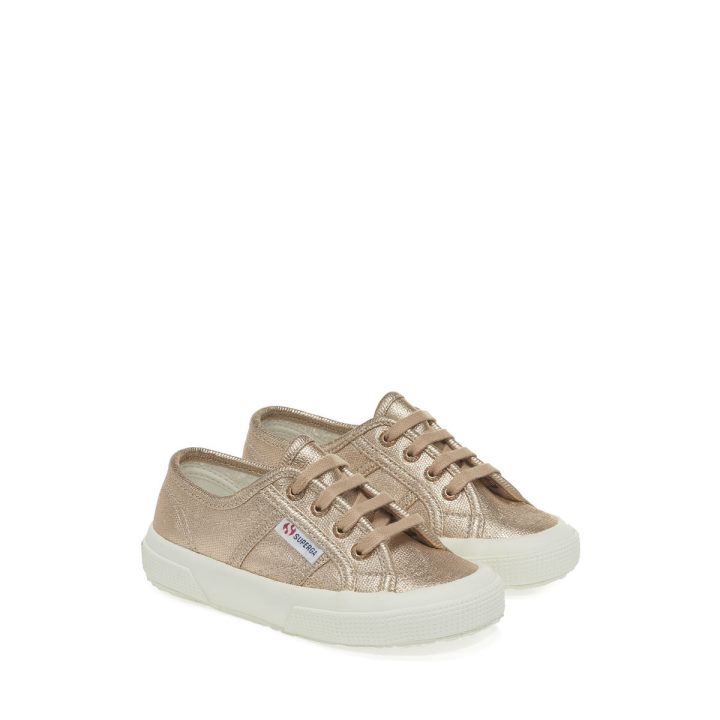 superga Pour Enfants Avec Tige En Coton Laminé Argent Et Or. Doublure En Coton Et Semelle Extérieure En Caoutchouc Naturel Vulcanisé