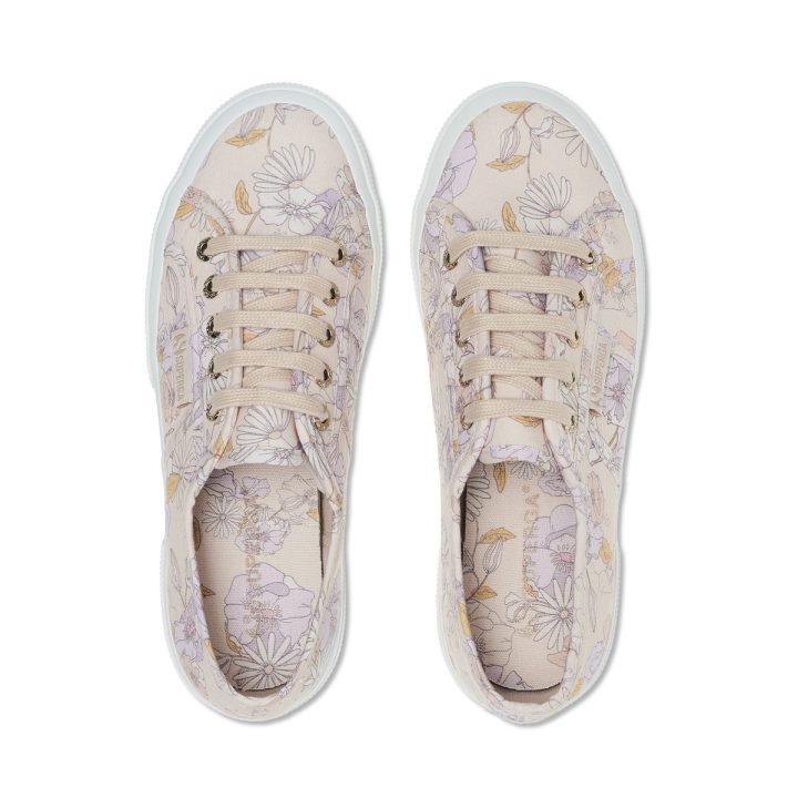 la Superga 2750 Avec Dessus En Coton Fin Imprimé Fleuri, Doublure En Coton Et Semelle Extérieure En Caoutchouc Naturel Vulcanisé.