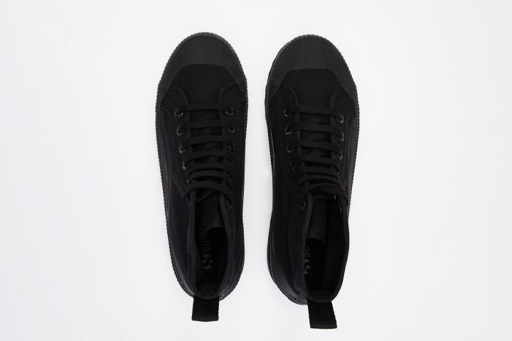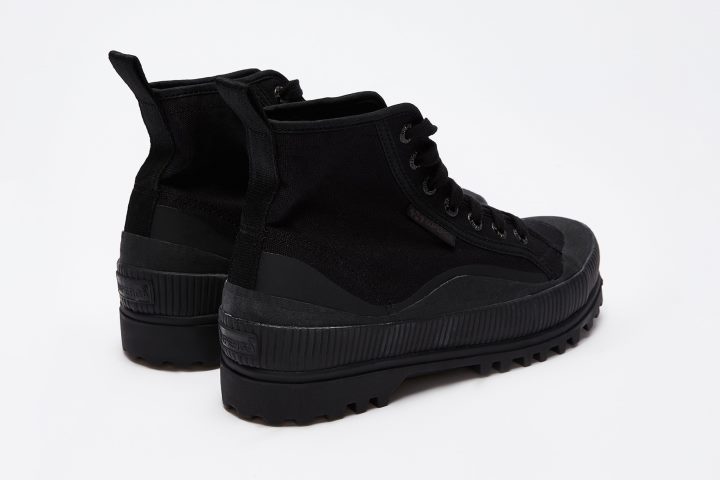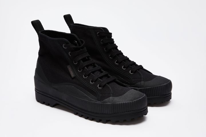 notre Héritage Militaire Prend Le Devant Avec Notre Silhouette Avant-gardiste L'aplina. Une Botte Mi-haute Avec Une Semelle Style Trek - La Semelle Alpina - En Caoutchouc Moulé. Un Redémarrage Qui A Ses Origines Dans L'héritage De Superga. Les Détails Incluent Une Bande Arrière En Gros-grain En Nylon Et Des Vagues En Relief En Caoutchouc Moulé Sur L'extérieur.